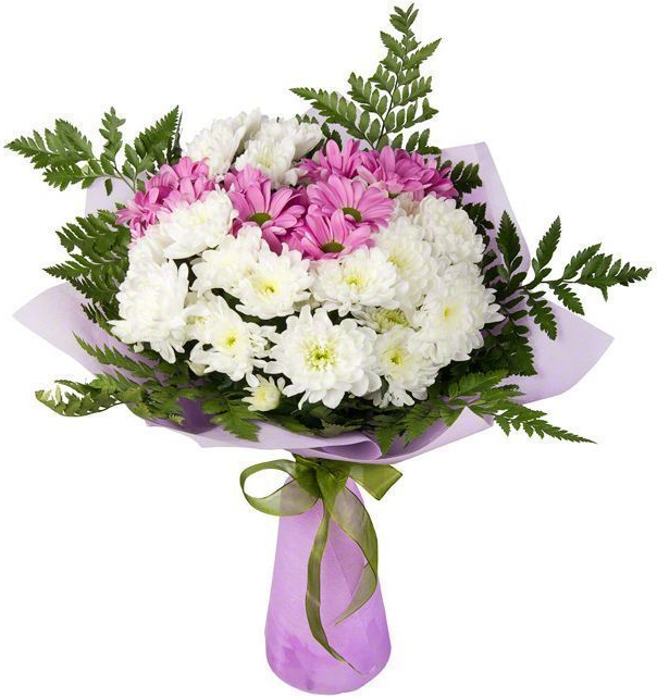 2 белые хризантемы, 1 розовая хризантема, папоротник, упаковка, лента3 белых хризантемы, 2 розовых хризантемы, папоротник, упаковка, лента4 белых хризантемы, 3 розовых хризантемы, папоротник, упаковка, лента